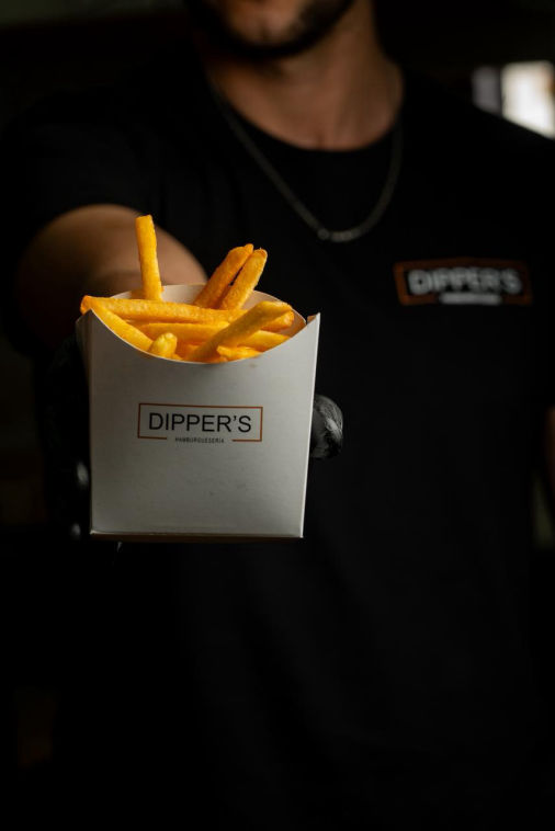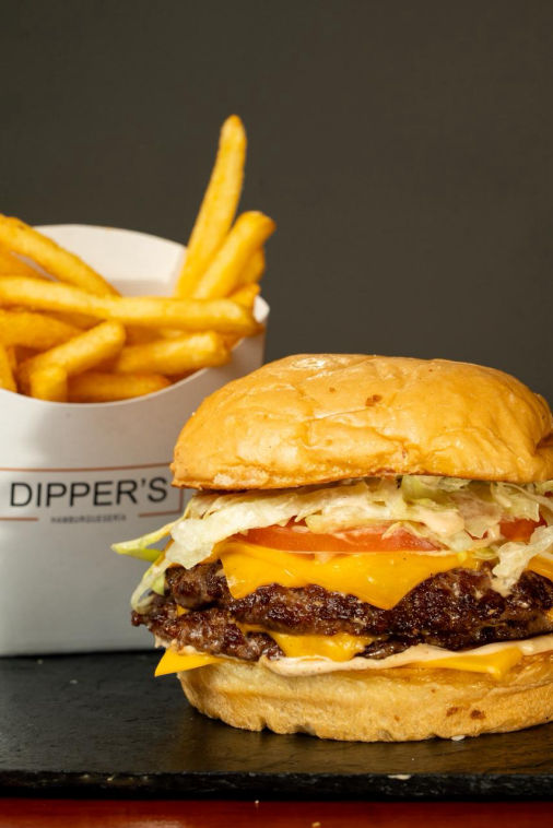 Medallón, lechuga, tomate, cheddar, cebolla, salsa Dipper´s.